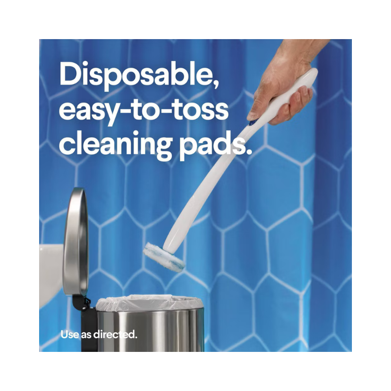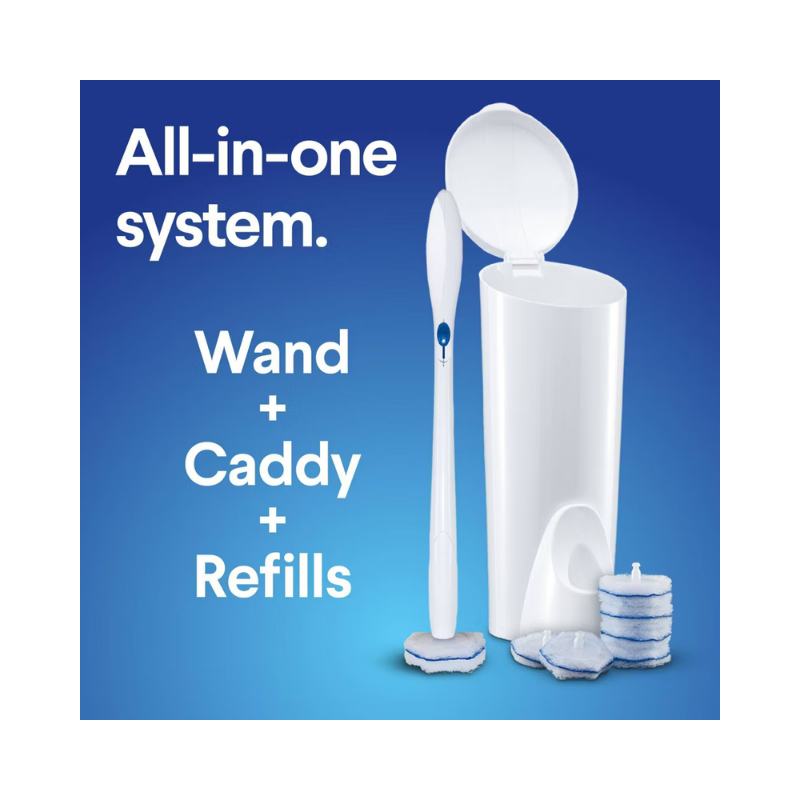 Clorox® ToiletWand® é um sistema tudo-em-um fácil de usar que torna a temida tarefa de limpar o vaso sanitário muito mais simples. O sistema completo contém: 1 bastão com cabo longo para ajudar a limpar à distância, 6 almofadas de esfregar descartáveis pré-carregadas com limpador e 1 suporte para armazenar convenientemente as recargas das almofadas. Cada almofada descartável de esfregar vem pré-carregada com o Limpador Clorox® que mata 99,9% dos germes*. As almofadas de esfregar removem manchas de água dura e calcário 2 vezes mais rápido do que ao usar uma escova de vaso sanitário com limpador manual. Nunca mais toque em uma escova de vaso sanitário suja: as almofadas descartáveis se soltam facilmente no lixo para que você possa descartar a sujeira toda vez. *Quando usado conforme as instruções.