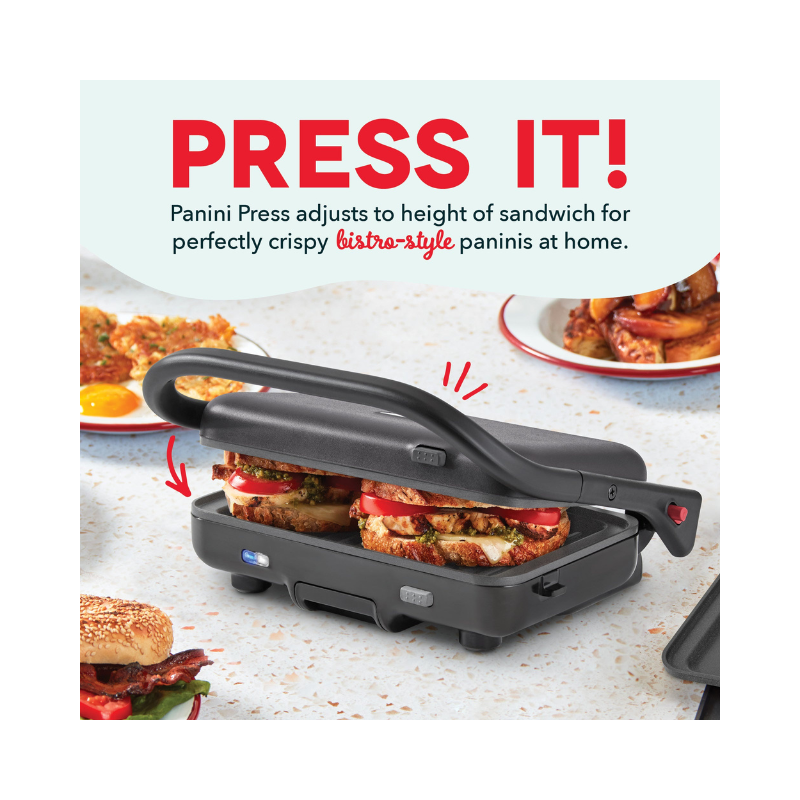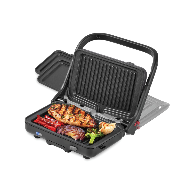 Mantenha-o fechado para grelhar ovos, bacon e panquecas no café da manhã ou abra a 180° para um churrasco interno direto na sua bancada – perfeito para hambúrgueres, frango, fajitas e muito mais! O sistema também funciona como uma prensa de panini estilo bistrô, com tampa articulada que mantém o pão crocante enquanto prensa.