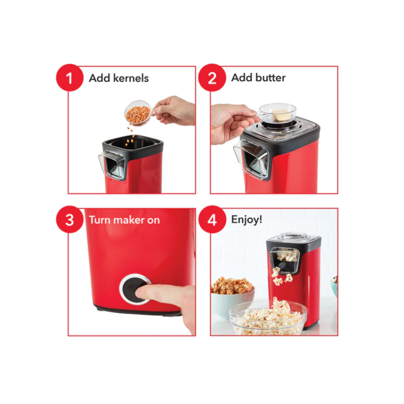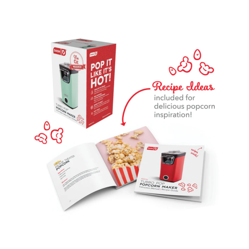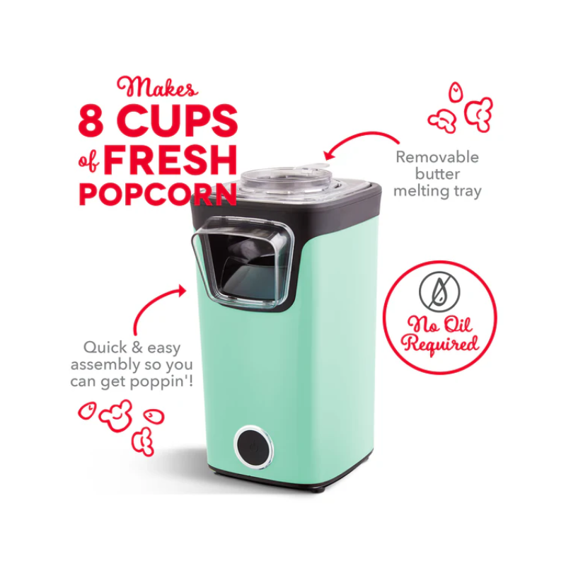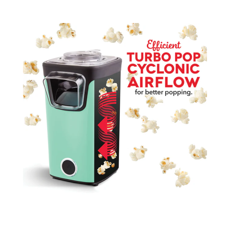 Dash Turbo Pop Popcorn Maker, prepara até 8 xícaras de pipoca fresca em minutos usando apenas ar quente, sem adição de óleo. Com um sistema único de circulação de ar super aquecido, ela é ideal para reuniões de qualquer tamanho. A xícara medidora inclusa também serve como bandeja para derreter manteiga, proporcionando pipoca no estilo cinema. Fácil de usar, com um botão de início único, e com um design compacto para economizar espaço de armazenamento. A máquina vem com pés antiderrapantes para maior estabilidade e é compatível com grãos de pipoca de tamanho padrão. Inclui a máquina, xícara medidora e guia de receitas. A garantia é de 1 ano, com opção de estender para 2 anos ao registrar no programa Feel Good Rewards.