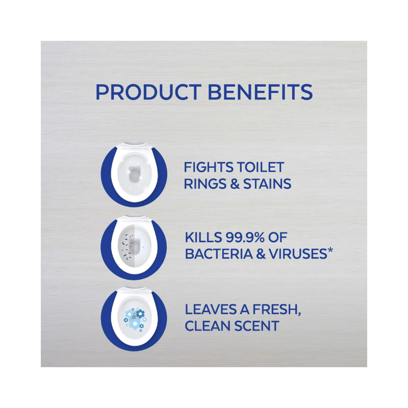 A fórmula espessa reveste toda a área do vaso, acima e abaixo da linha d’água, para remover manchas de calcário, manchas de água dura, depósitos minerais e sujeira do dia a dia. A embalagem com bico angular alcança áreas de difícil acesso, incluindo sob a borda, deixando todo o vaso sanitário brilhando de limpo e desinfetado. Seguro para uso em sistemas de encanamento e fossas sépticas.