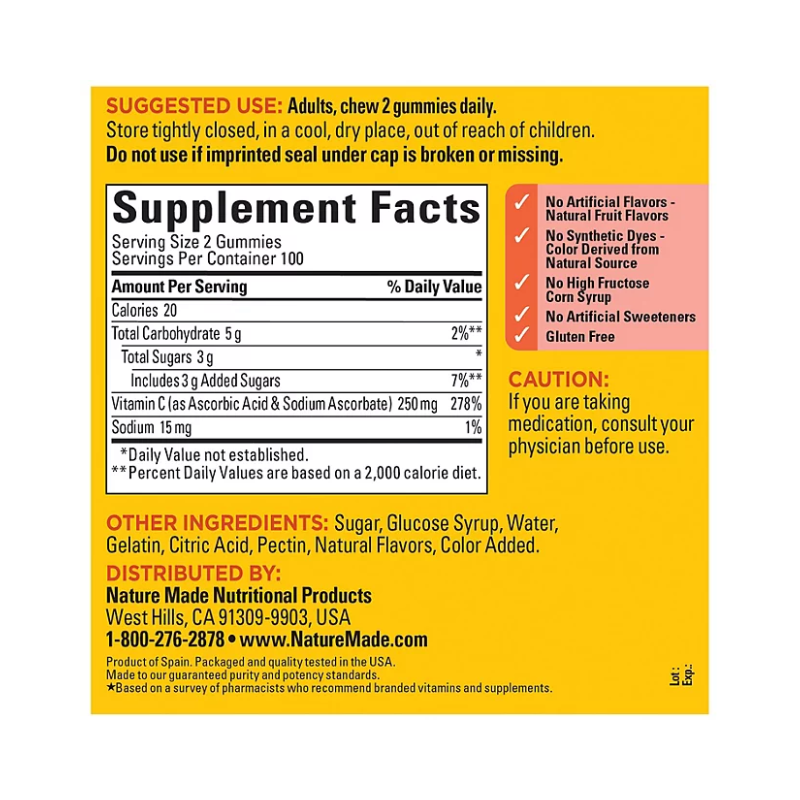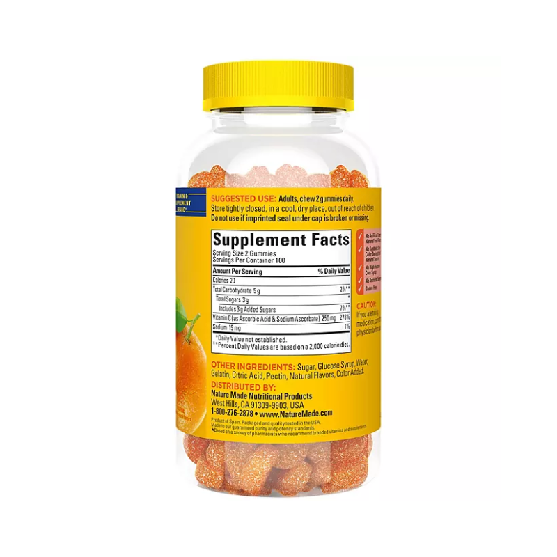 Nature Made Vitamin C Adult Gummies, Essas gomas de vitamina C (250 mg por porção) da Nature Made apoiam o sistema imunológico, fornecem suporte antioxidante e auxiliam na absorção de ferro. Feitas com ingredientes de alta qualidade, essas gomas têm sabor de tangerina e não contêm glúten, adoçantes artificiais, corantes sintéticos ou xarope de milho com alto teor de frutose. A vitamina C também contribui para a síntese de colágeno, beneficiando a saúde da pele. Recomendam-se duas gomas por dia para adultos.