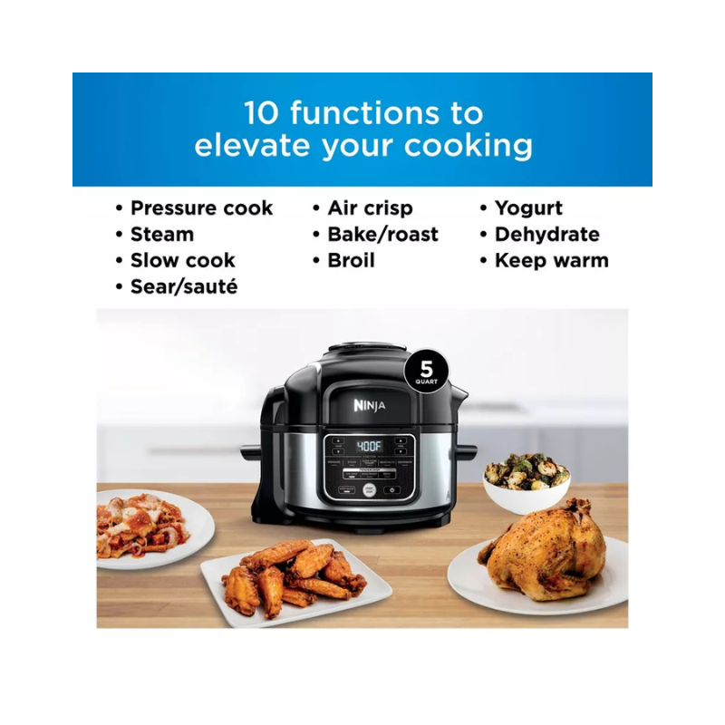 A Ninja® Foodi® 10-em-1 Panela de Pressão + Air Fryer de 5 litros combina o melhor do cozimento sob pressão e da fritura a ar em um único aparelho com a tecnologia TenderCrisp™. Prepare alimentos suculentos e macios por dentro, com acabamento dourado e crocante por fora.