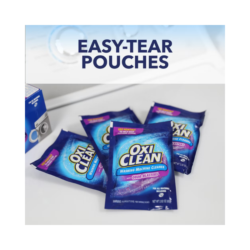 Ajude a remover resíduos causadores de odores na sua máquina de lavar com o Limpador de Máquina de Lavar OxiClean com Odor Blasters. Se você percebeu odores nas roupas, a causa pode ser sua máquina de lavar. Esses sachês pré-dosados combinam Odor Blasters com o poder de OxiClean para limpar a máquina de lavar, remover odores e manter o frescor. Para usar, rasgue um sachê de limpador de máquina e coloque em uma máquina vazia, sem roupas ou outros itens. Selecione o ciclo de limpeza da máquina e execute sem detergente. Se a máquina não tiver esse ciclo, use o ciclo normal com água quente. Após o ciclo, limpe qualquer resíduo restante com uma toalha e deixe a porta da máquina aberta para ventilação. Para manutenção, utilize o limpador de máquina de lavar OxiClean uma vez por mês para manter sua máquina (HE ou padrão) limpa e cheirosa. Para odores e resíduos existentes, use uma vez por semana durante três semanas consecutivas, depois mensalmente. Inclui uma caixa com 4 sachês do Limpador de Máquina de Lavar OxiClean com Odor Blasters, seguro para sistemas sépticos.