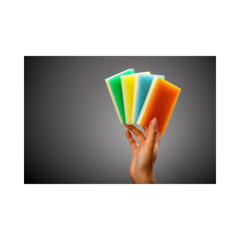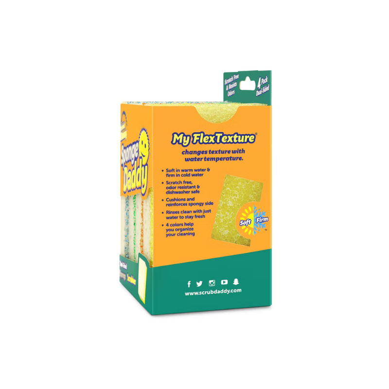 Esfregue, vire e limpe para obter uma limpeza completa com o Sponge Daddy! Seu design de dupla face combina dois materiais de alta tecnologia para uma experiência de limpeza versátil. A espuma FlexTexture® sem riscos muda de textura com a temperatura da água: fica firme em água fria para esfregar intensamente e macia em água morna para uma limpeza leve. Do outro lado, a supermacia ResoFoam® é 6 vezes mais absorvente que a marca líder e resiste a manchas e odores. Além disso, a ResoFoam® gera 60% mais espuma do que a concorrência, proporcionando uma espuma rica com menos sabão.