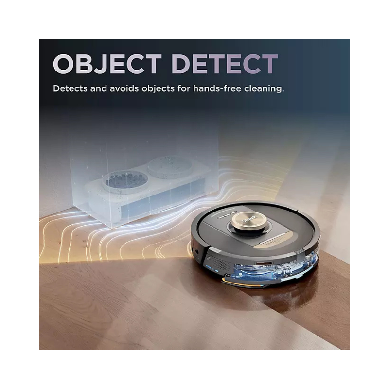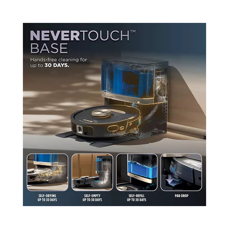 Base NeverTouch™ – esvaziamento automático do reservatório de sujeira, reabastecimento do tanque de água e secagem do mop, garantindo semanas sem manutenção manual.
